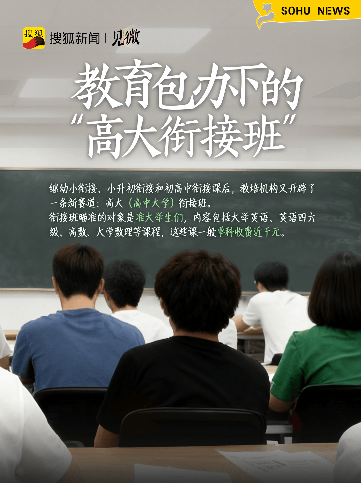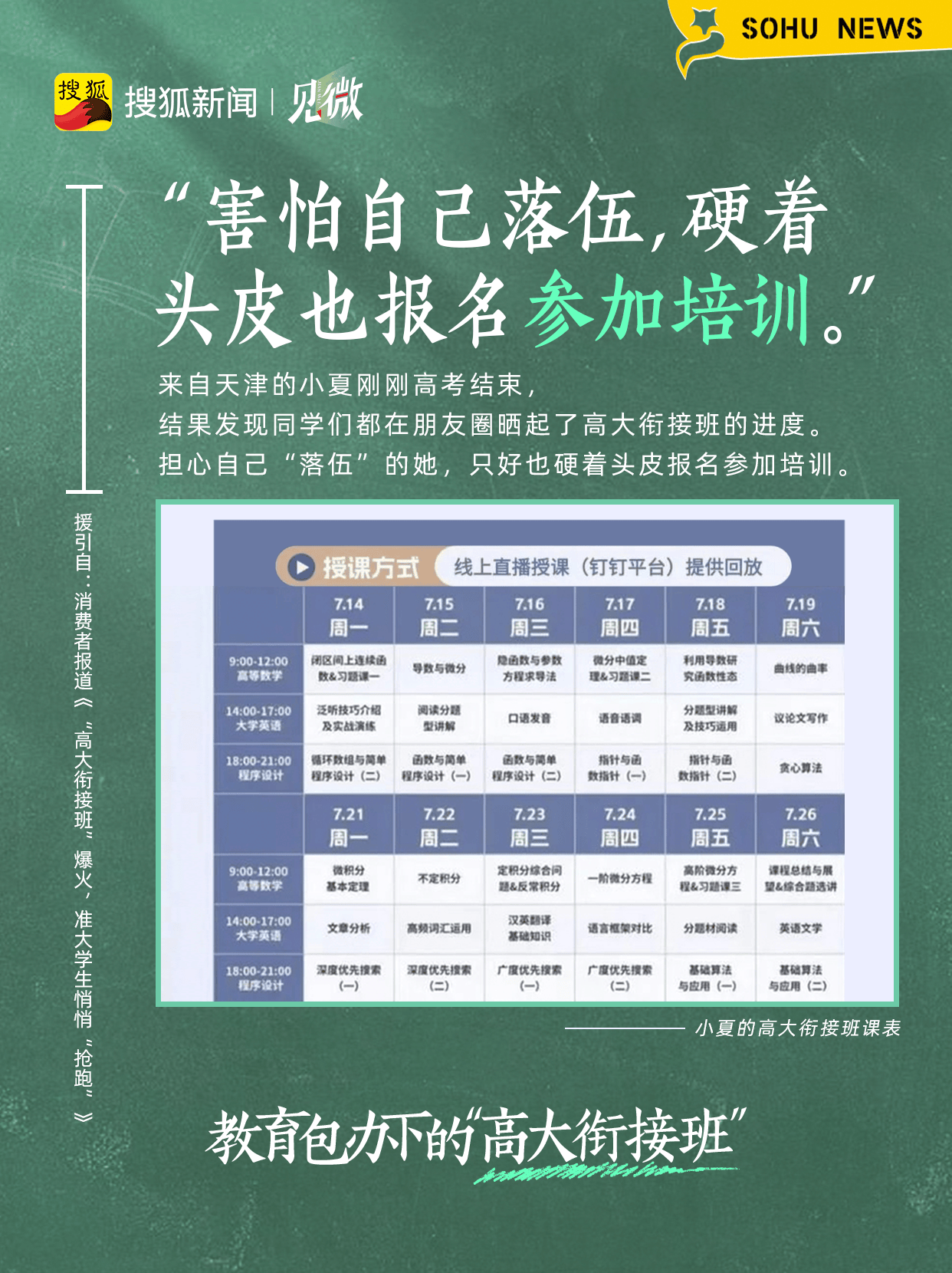 今年暑假,继幼小衔接、小升初衔接和初高中衔接课后,教培机构又开辟了一条新赛道:高(中)大(学)衔接班。他们这次瞄准的对象是准大学生们,让他们在高考后的暑假提前学习大学知识。英语四六级、高数、大学数理……这些课一般单科收费近千元,但仍然有不少学生和家长趋之若鹜,校园尚未开启的时候,竞争就已经到来。