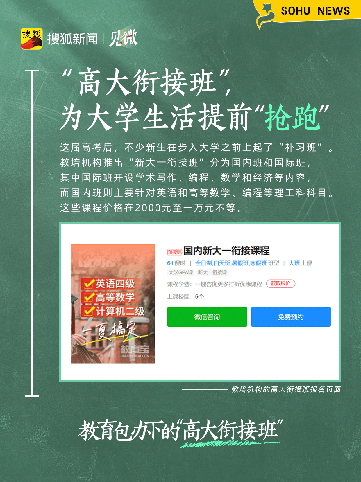 最常见的的“高大衔接班”是由教培机构推出的,利用高中到大学的暑假时间,衔接起高三和大一。很多教培机构的“高大衔接班”分为国内班和国际班,其中国际班开设学术写作、编程、数学和经济等内容,而国内班则主要针对英语和高等数学、编程等理工科科目。这些课程价格在2000元至一万元不等。