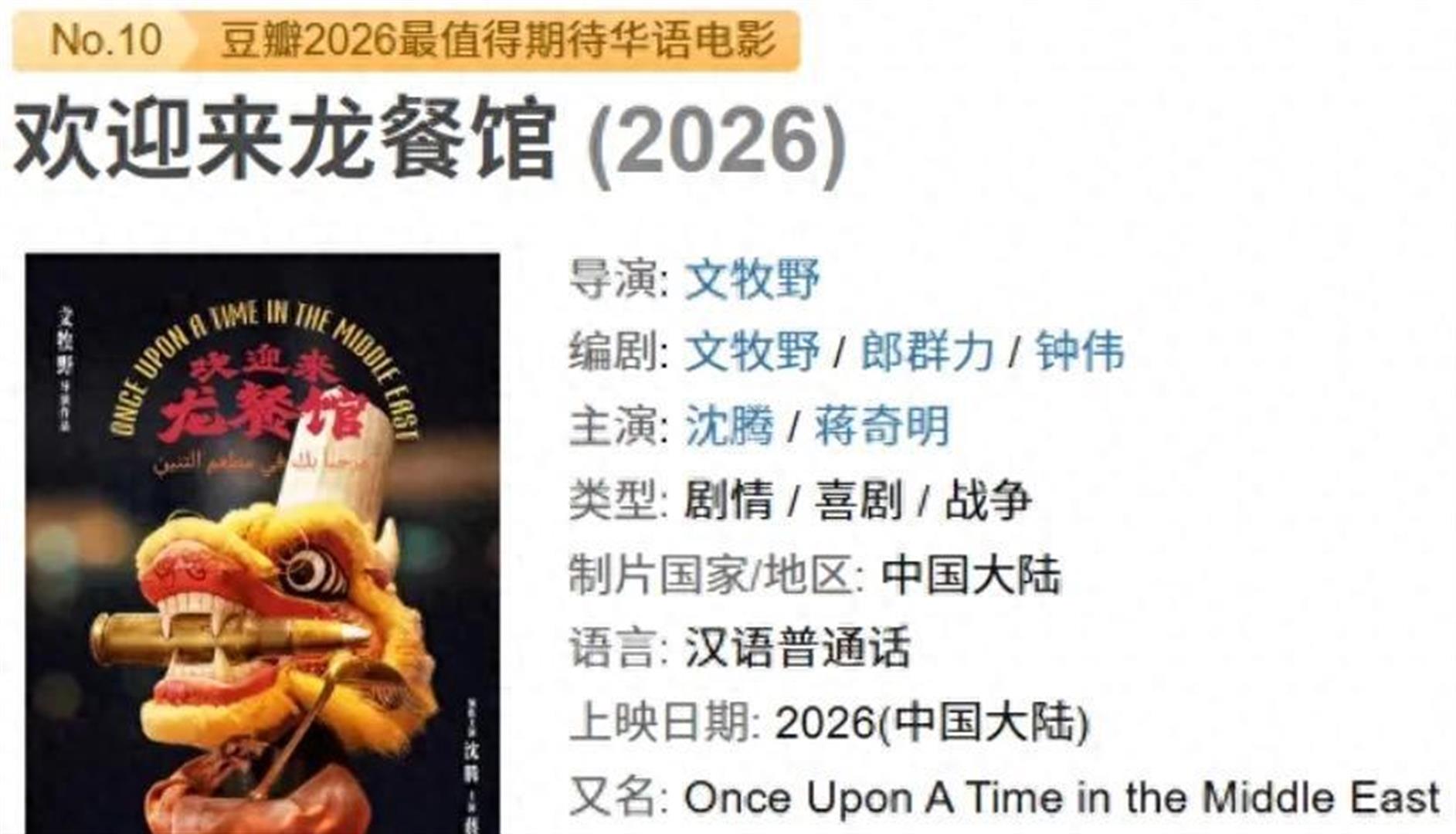 继《我不是药神》《奇迹·笨小孩》之后,导演文牧野携2026年春节档重磅新作《欢迎来龙餐馆》回归,依旧聚焦小人物命运,将镜头对准战火纷飞的中东地区,讲述一家普通中餐馆里的温暖救赎故事。影片由沈腾、蒋奇明领衔主演,延续了文牧野一贯的“现实主义+温情喜剧”风格,没有刻意渲染战争的残酷,而是用细腻的笔触刻画乱世中普通人的善良与坚守,上映后斩获票房与口碑双丰收,成为2026年国产现实题材的标杆之作。